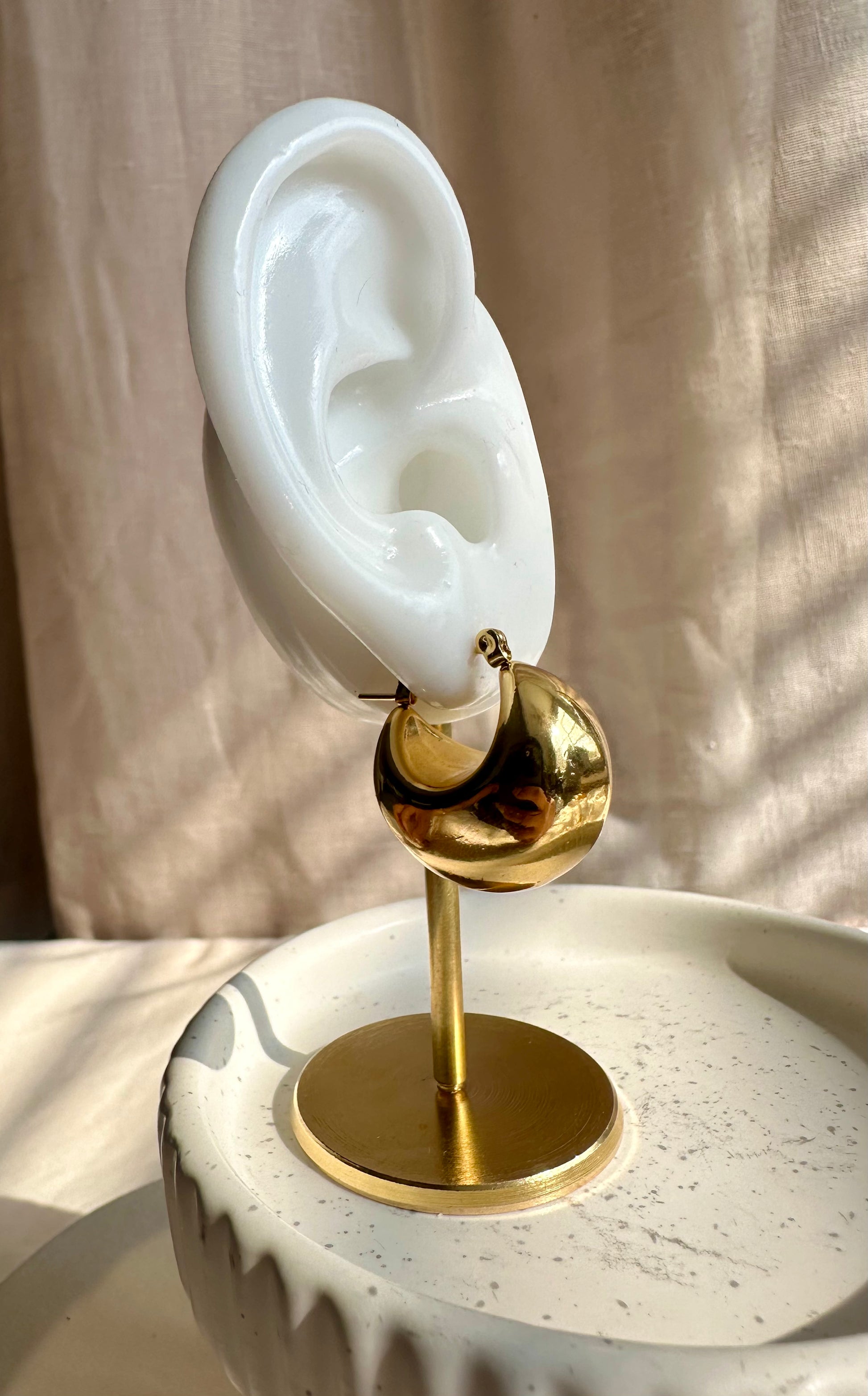 Soluna is the harmony of two mundos — the warmth of the sun and the calm of the moo— meeting in one bold, golden curve. Designed for the woman becoming her nueva versión, these hoops celebrate balance: soft but poderosa, minimal but statement, timeless but modern.